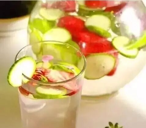 黄瓜洗净切片,草莓对半切开,甜罗勒洗净。倒入大玻璃容器中,倒入矿泉水,泡2-3小时(冷藏浸泡)。饮用前可以选择加入冰块。