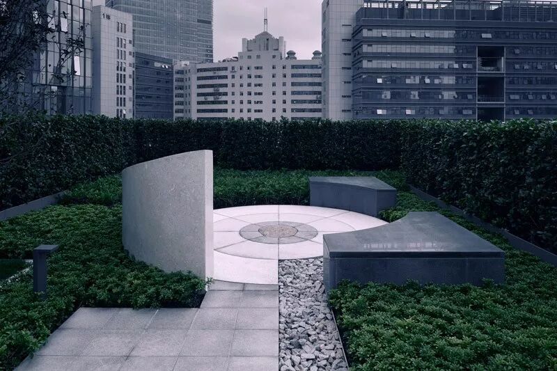 通过过道进入庭院,沿着铺装走进休憩平台,不同的石材铺装丰富了平台地面,结合景观石凳,客人坐在景观石凳上可以眺望远处自然与抽象结合的雕塑。