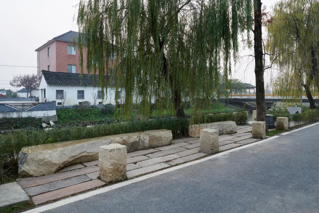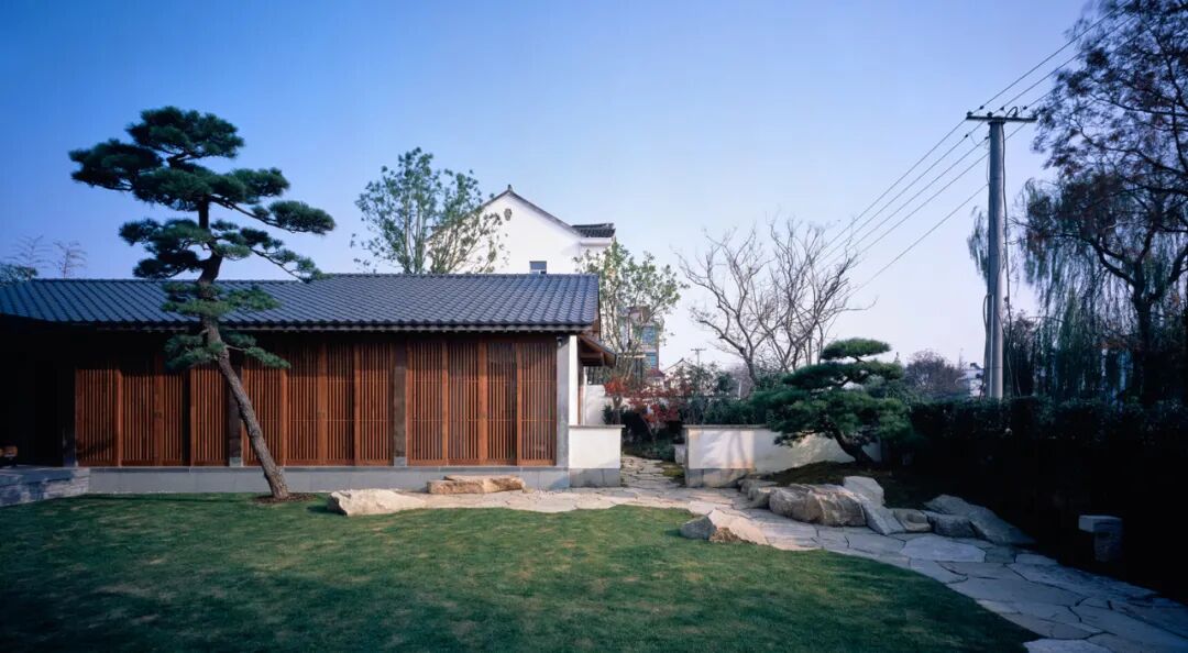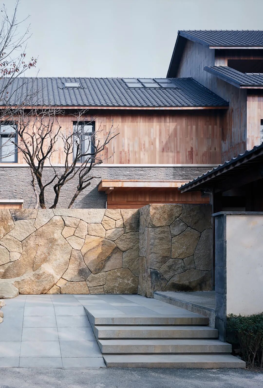 庭院入口是相对简单、面层处理稍微有变化的过道区域,通过一个特殊造型的眺望平台,把客人视线引入庭院,庭院内放置着表情各异的石条,错落地摆放在碎石上,以此展现出一个具有仪式感的远眺景观。
