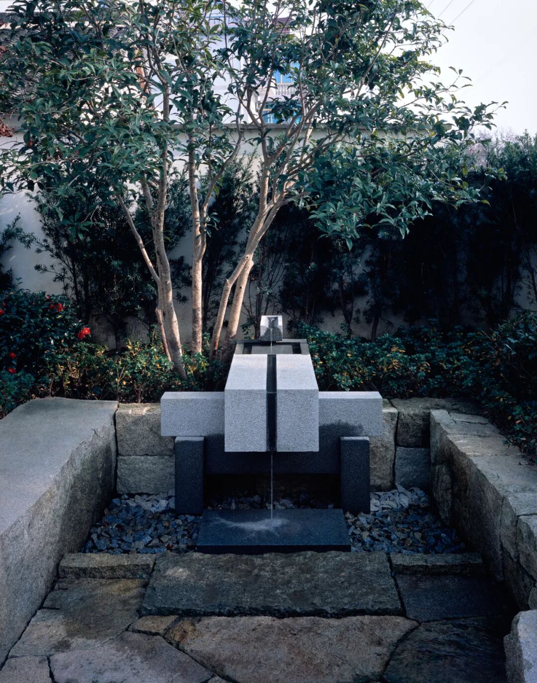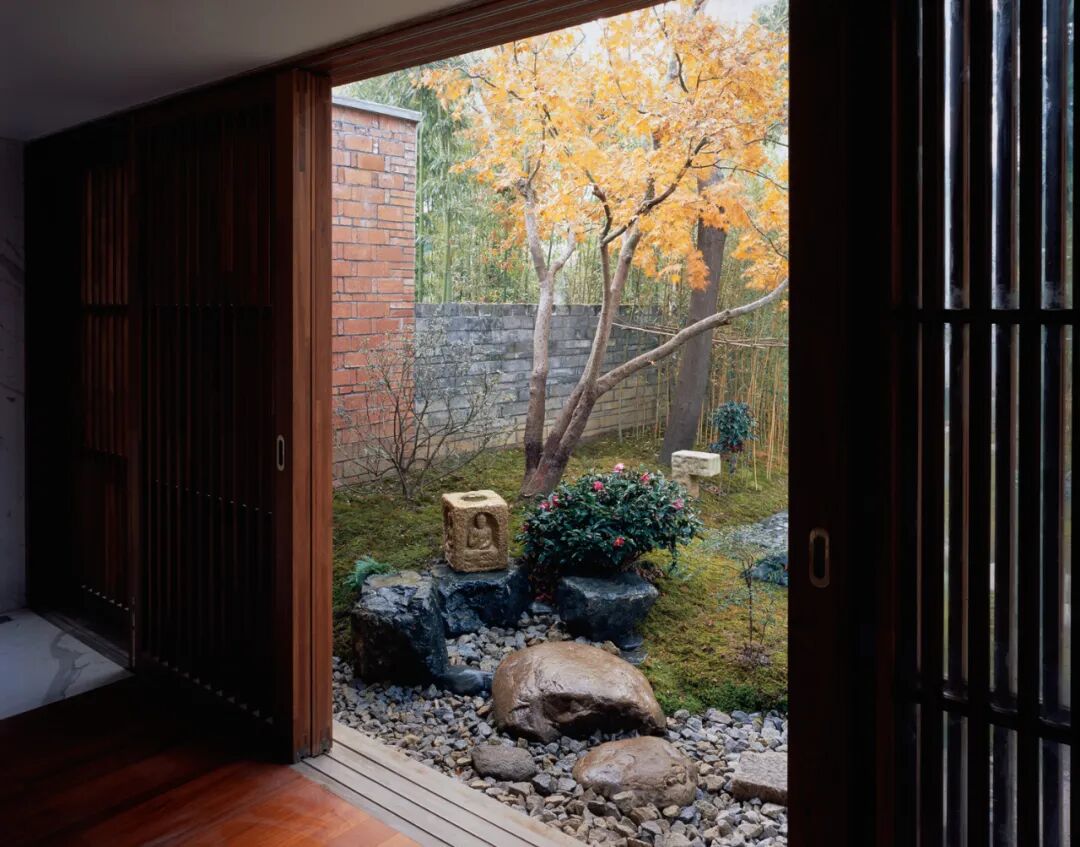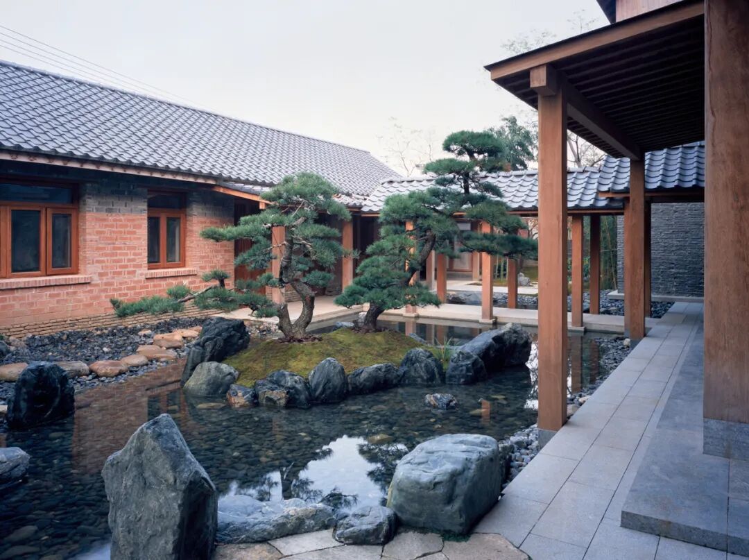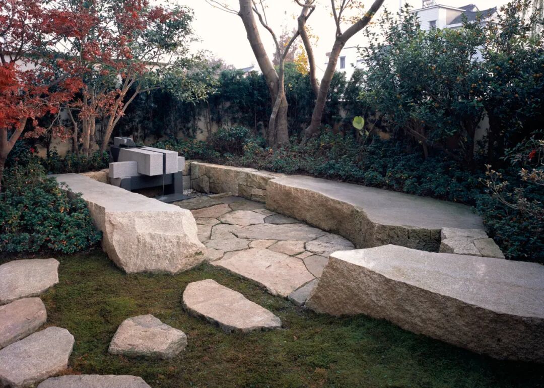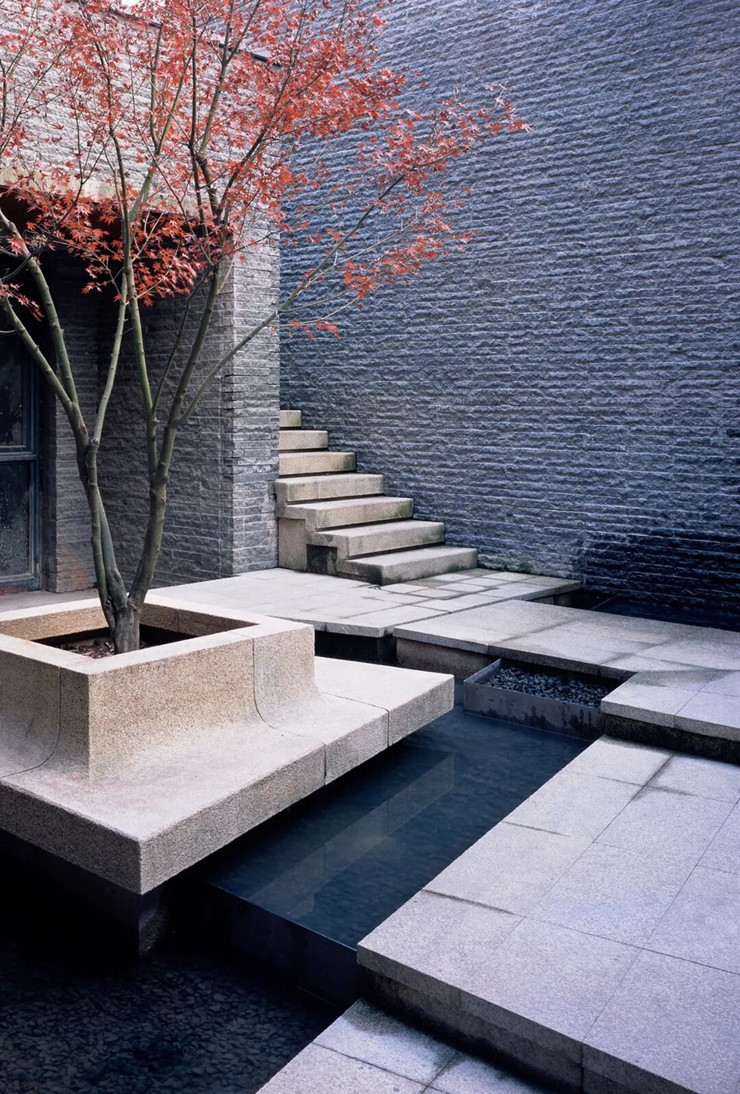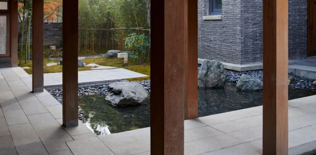室外庭院的铺装使用了大块的石条,带给人厚重的感受,将观赏者视线引入庭院,走出庭院能透过植物缝隙看到若影若现的瀑布水景。
