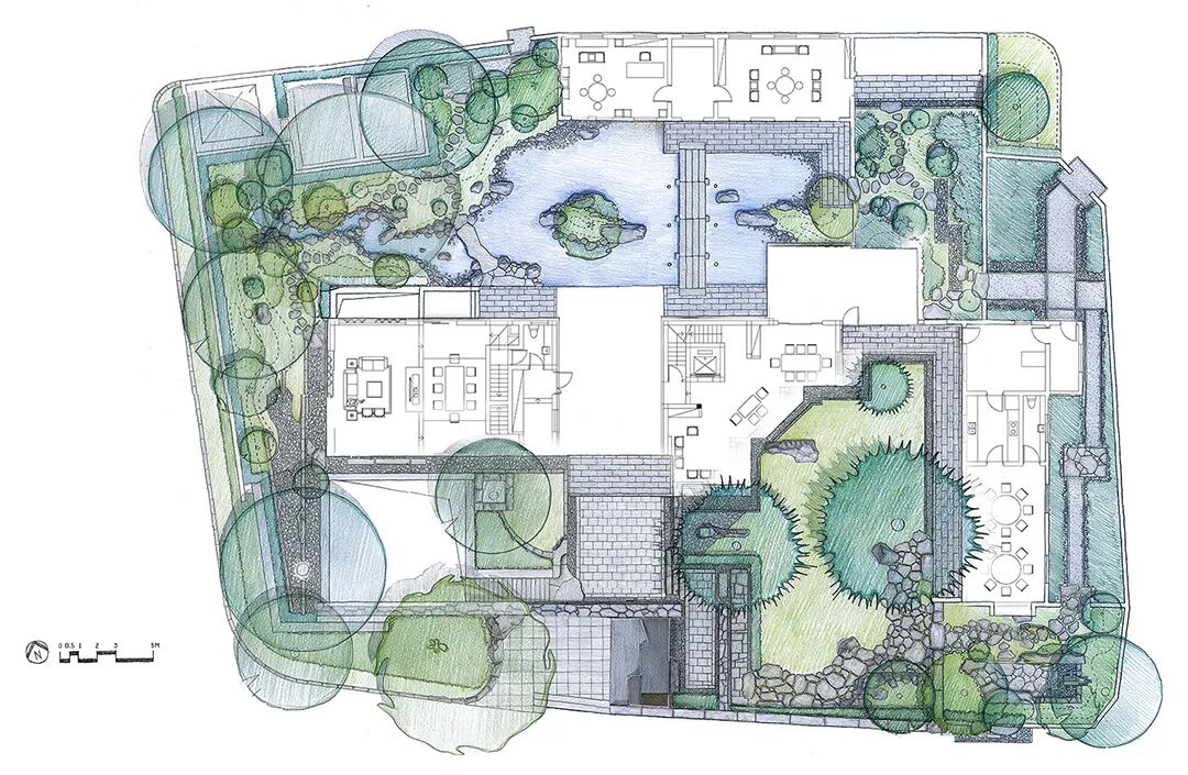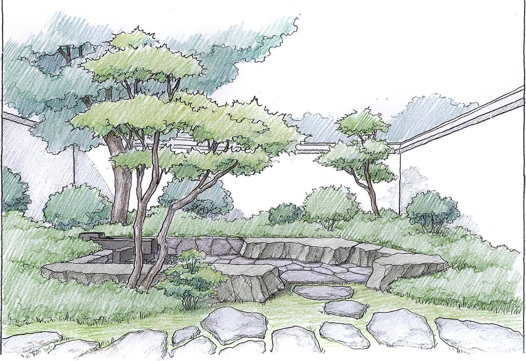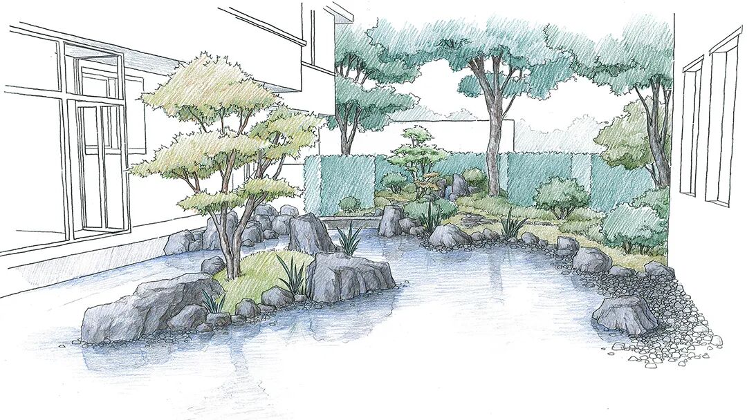 一层是会所的主入口和迎接空间。已建成的会所建筑立面简洁现代,所以庭院采用沉稳的铺装和雕塑化的石组与建筑融合。