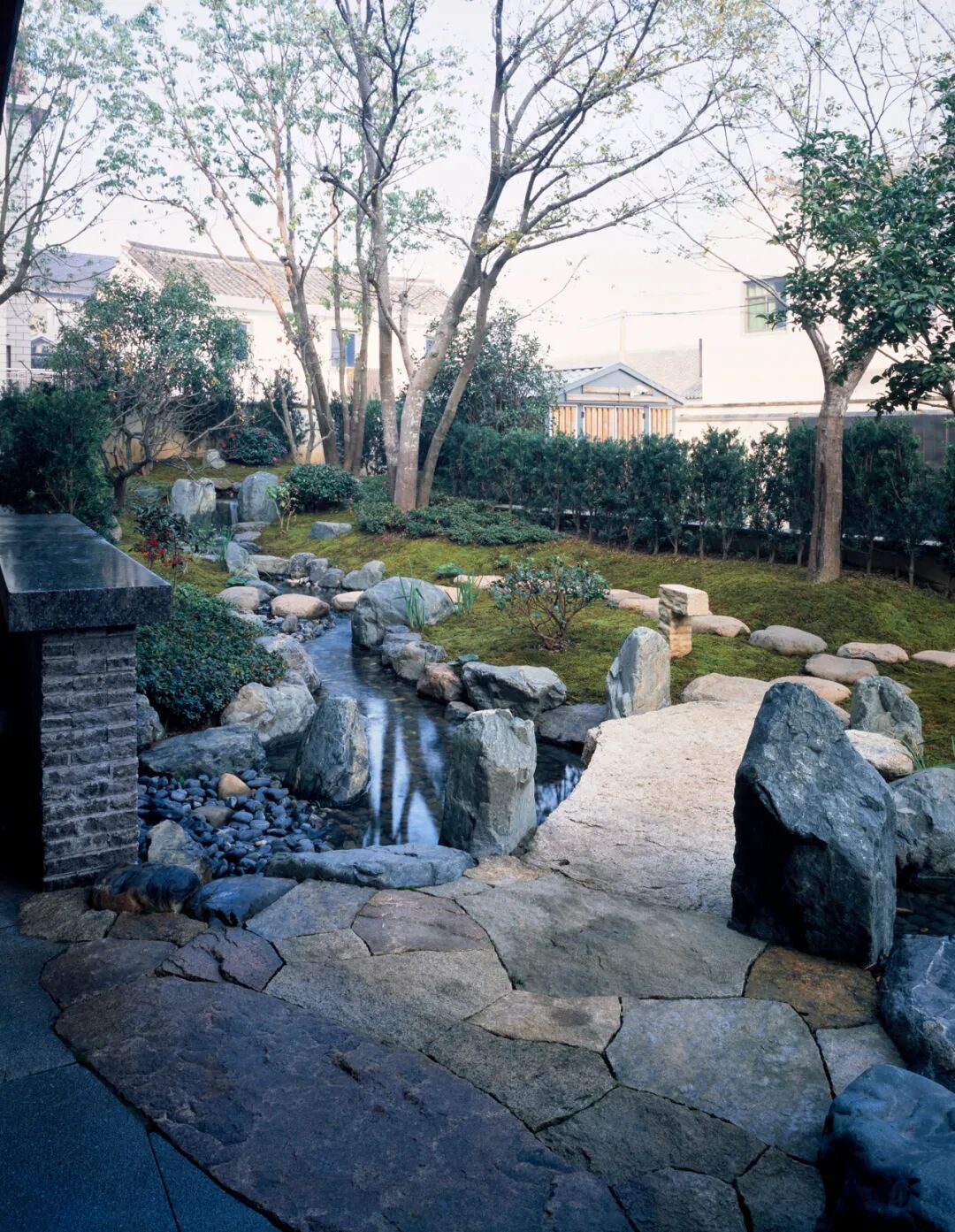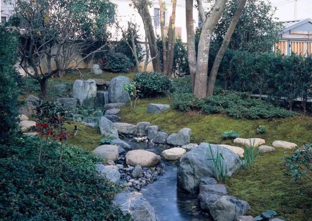 庭院入口处是乱拼平台,庭院深处为一组自然石蹲踞,呈现出一个自然、雅致的景观氛围。