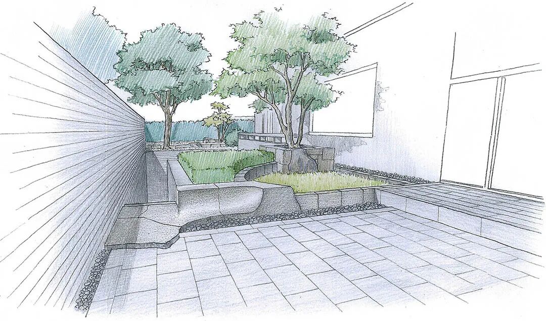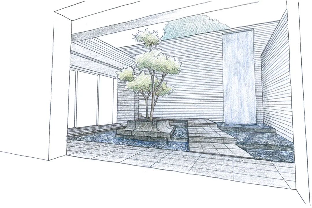 二层庭院对应的室内空间是日式餐厅,整体庭院呈对角布置,创造景深。
