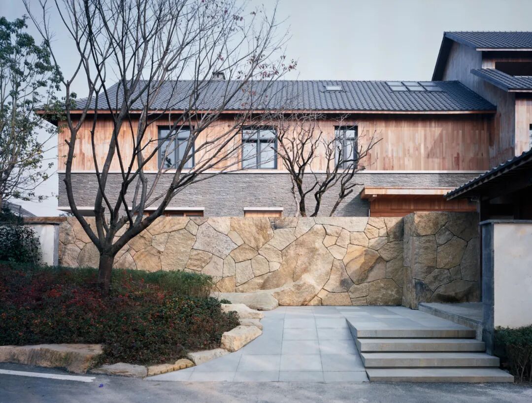 利用现场存在的地形高差,进入大门到达入口平台,通过台阶可以走上入户庭院,台阶边通过雕塑化处理的景石挡土、堆坡消化现场存在的高差问题,同时通过植物和景石的配合形成丰富的视觉体验。进入到入户庭院正中是平整、简洁的入户通道,通往会所入口。
