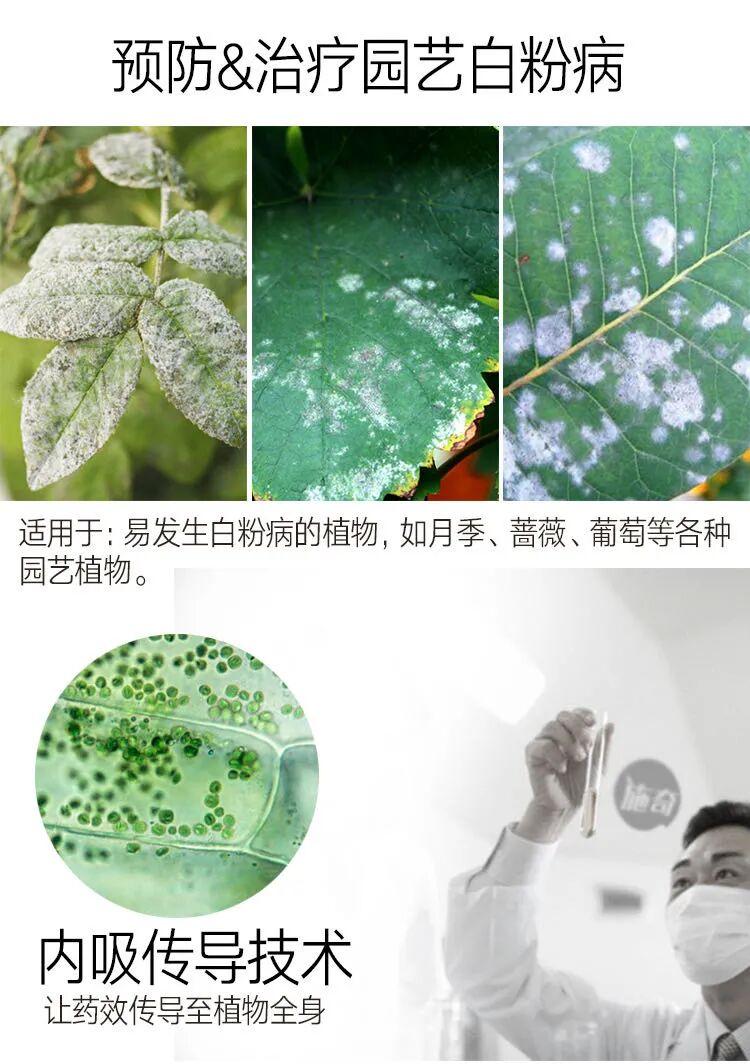 √ 内吸传导性和速效性强,能被植物叶片快速吸收并在体内传导,能有效杀灭侵入植物体内的白粉病病原菌和菌丝体,治疗效果更加优秀。