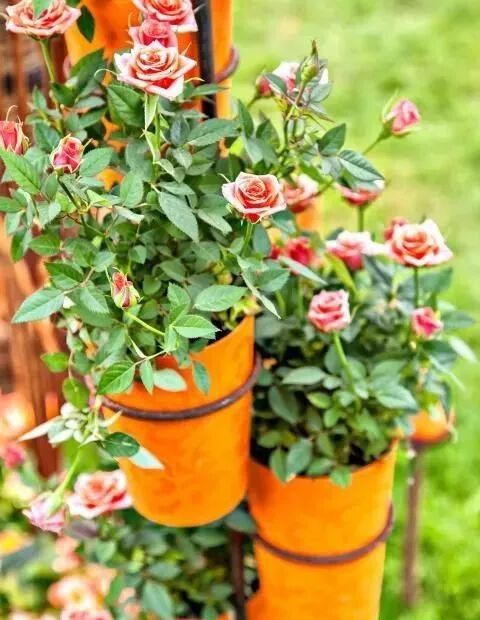 现在市场上很流行的‘迷你玫瑰’就是这一类月季,你可以把它们种在挂篮或者是栏杆上的花盆中。