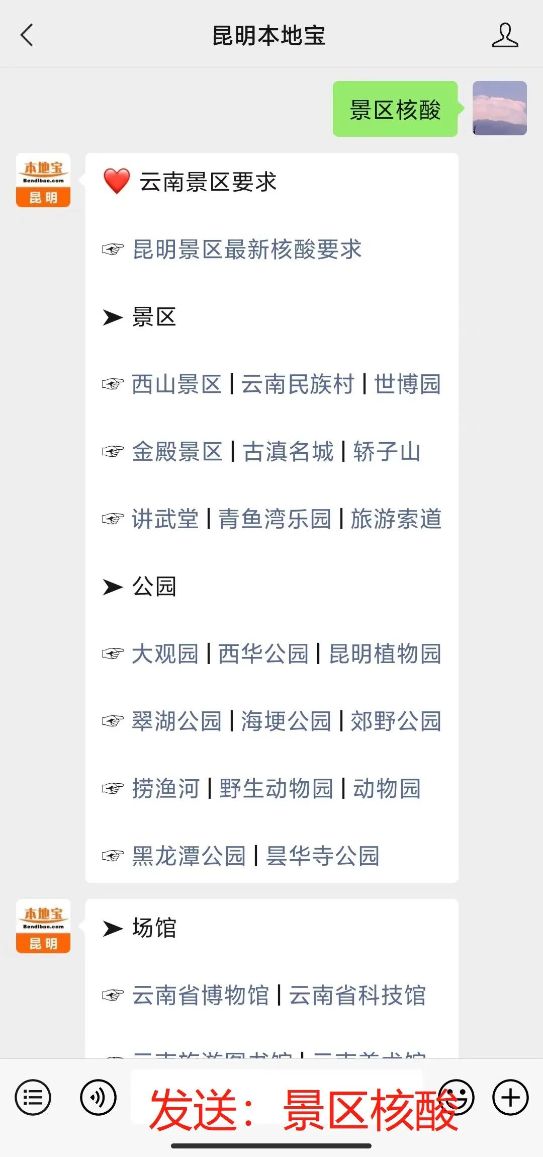 昆宝提醒:点击下方卡片,关注【昆明本地宝】微信公众号,在聊天对话框发送【活动延期】,即可获取近期活动延期或取消汇总;发送【景区核酸】,即可获取景区核酸要求汇总。