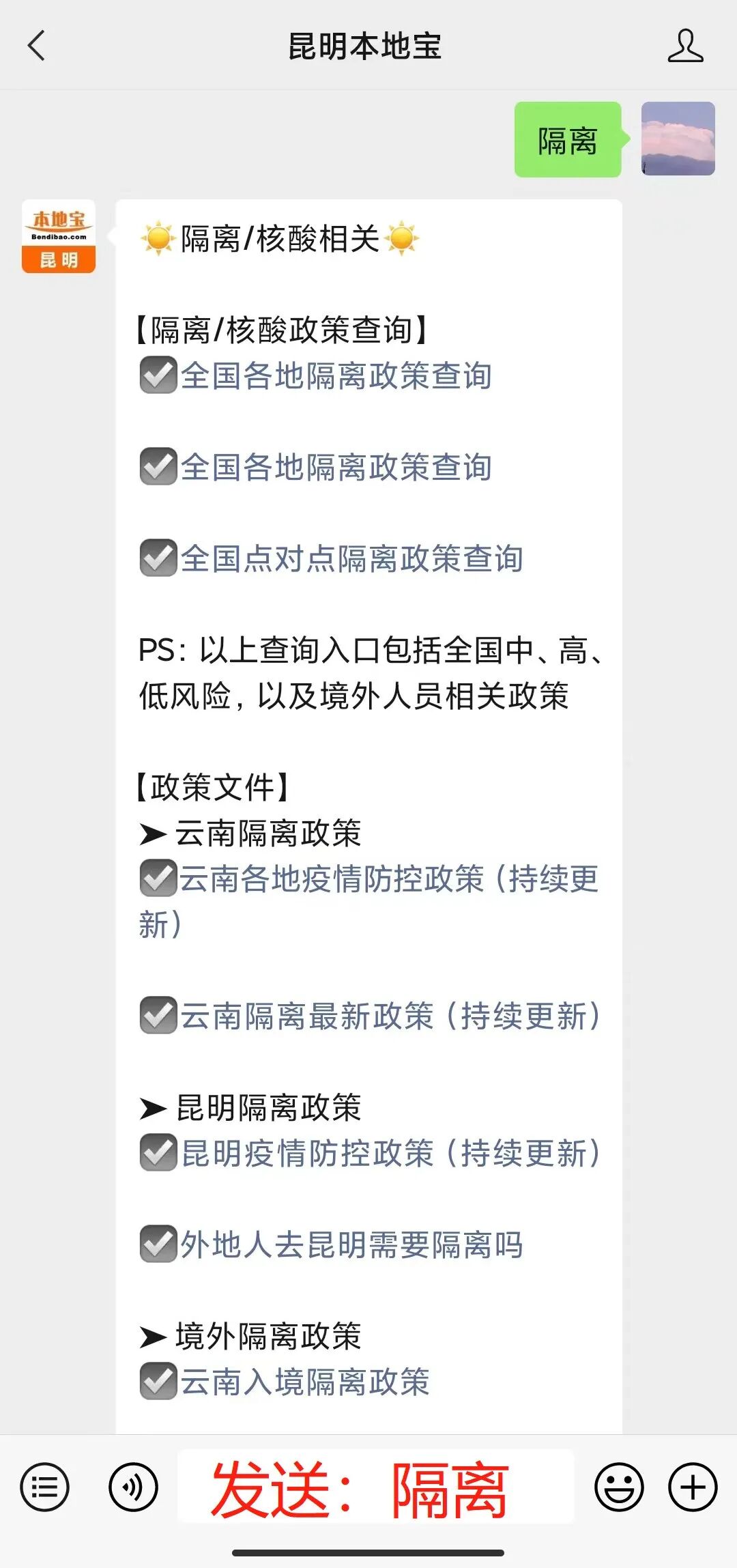 点击下方卡片,关注【昆明本地宝】微信公众号,在聊天对话框发送【隔离】,即可获取云南各地防疫政策。