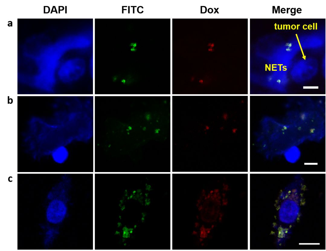 为了研究药物是如何从中性粒细胞释放进而发挥作用,研究人员将脑胶质瘤细胞铺在共聚焦显微镜专用的培养皿上,然后与细胞药物输运体系共孵育2h后,发现有大量NETs的形成,同时可见荧光标记的纳米颗粒存在于中性粒细胞形成的诱捕网中(图3a, b)。进一步延长孵育时间到4h,可在肿瘤细胞核周围观察到纳米颗粒的存在(图3c)。这些结果表明,载药纳米颗粒随着NETs的形成,可从中性粒细胞释放并被肿瘤细胞吞噬。