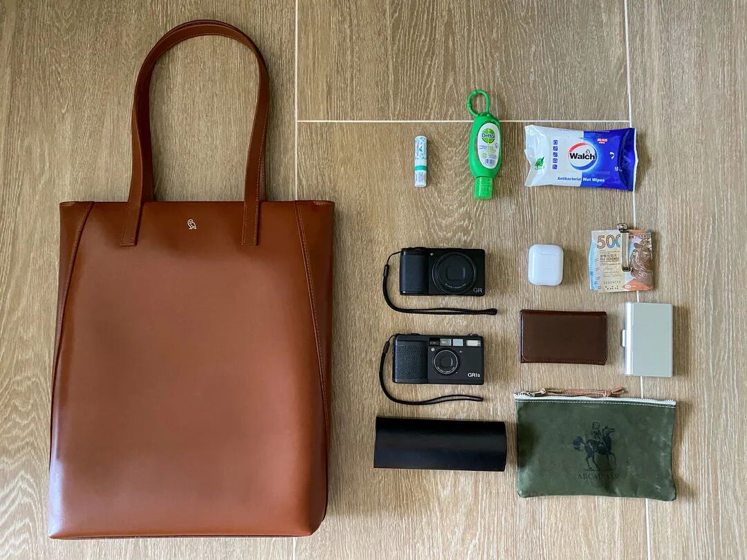 我的包里一定会装有相机 - 理光GR3(胶片机GR1s 则视乎天气),pocket size 便于携带,出片锐利,适合扫街。其余的是一些必备物品,如 AirPods、钱夹、卡包等。受疫情影响,消毒物品也是必备。