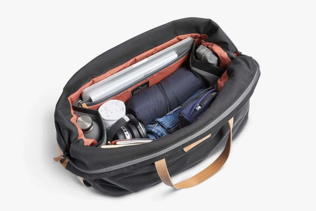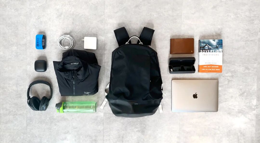 13英寸的苹果电脑、Bose Quiet Comfort 35耳机、眼镜、薄荷糖还有我的 Bellroy 钱包!