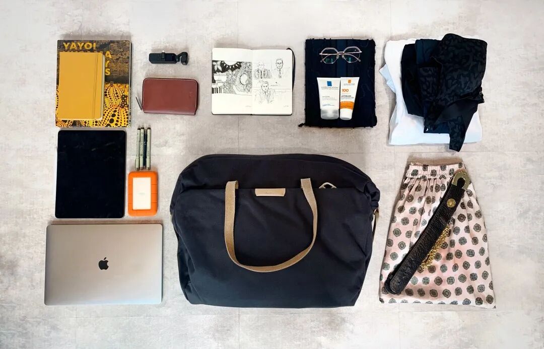 我的背包里的必备品有画笔、日记、速写本、iPad和相机。在外时,创作的灵感随时可以出现,所以画画、写作和拍摄的工具不能离手。当然,充电器、钱包等日常实用的物品我也会带着。旅行的时候,我会带上一本“livre de poche”,法语翻译过来就是一本方便携带的「口袋书」。相对于在旅行漫长的等待的时候刷手机,我更喜欢沉陷到一本书的世界里面。即使这款包是旅行包,旅行的时候里面也会装衣服啦。