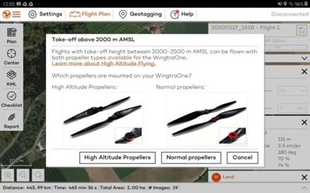 这种新型螺旋桨现在可以作为任何翼型无人机的附件出售,而且很容易通过环形系统识别与区分。该公司本月第一次发货时,在发布的软件中更新提供了指导和安全功能。也就是说,除非安装了高空螺旋桨,否则任何在2500米(8200英尺)以上的飞行计划都将不会被执行。当无人机在2500米(8200英尺)以下飞行时,普通的WingtraOne螺旋桨可以被替换,因为它们可以提高低空飞行的效率。飞行时间和电池充电状态将由新的、复杂的算法来监控,这些算法也会考虑无人机的飞行高度问题。
