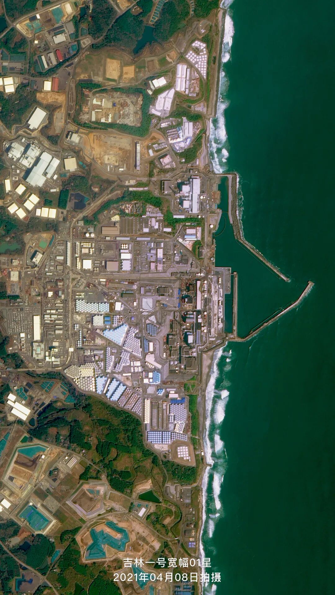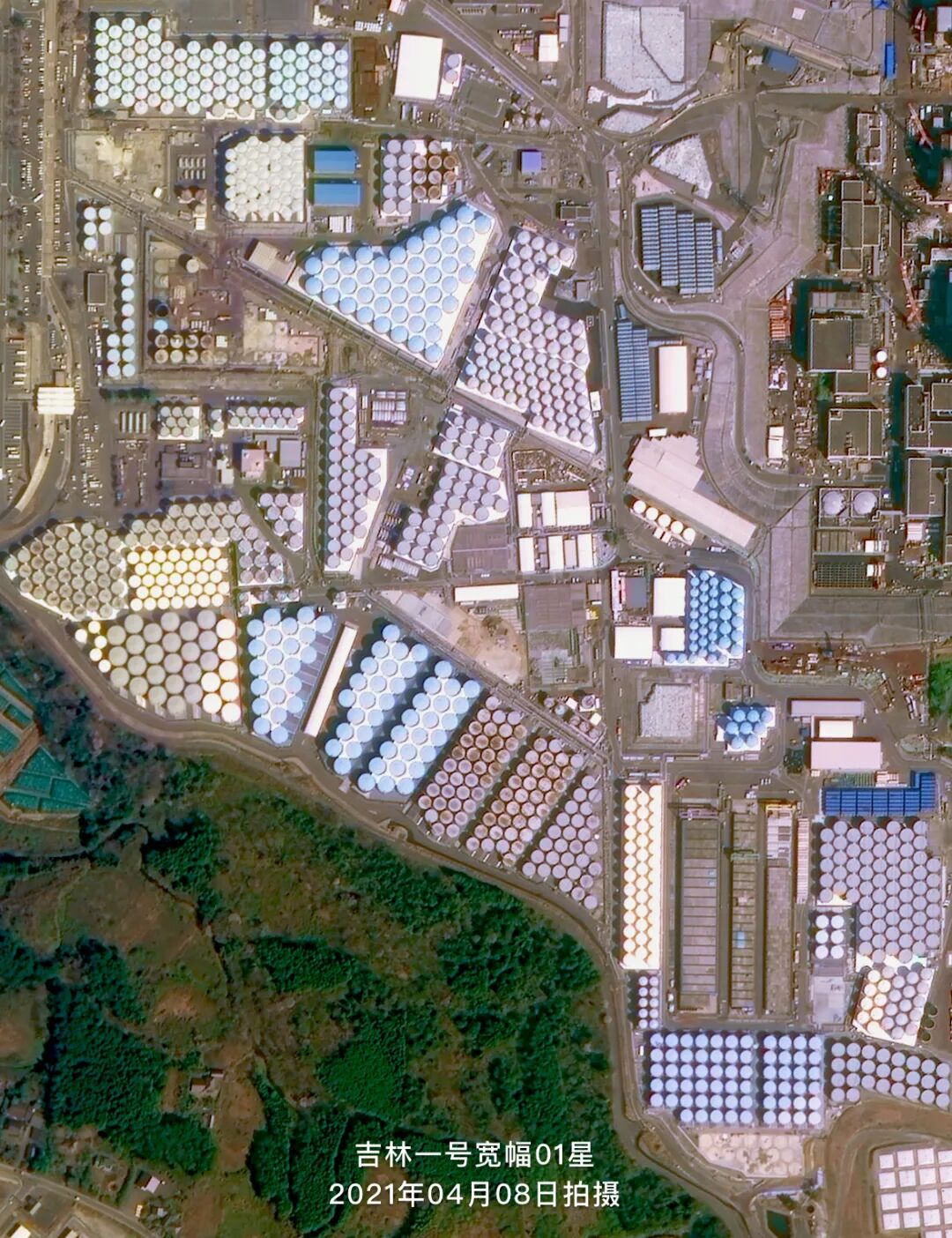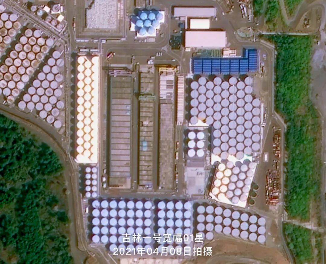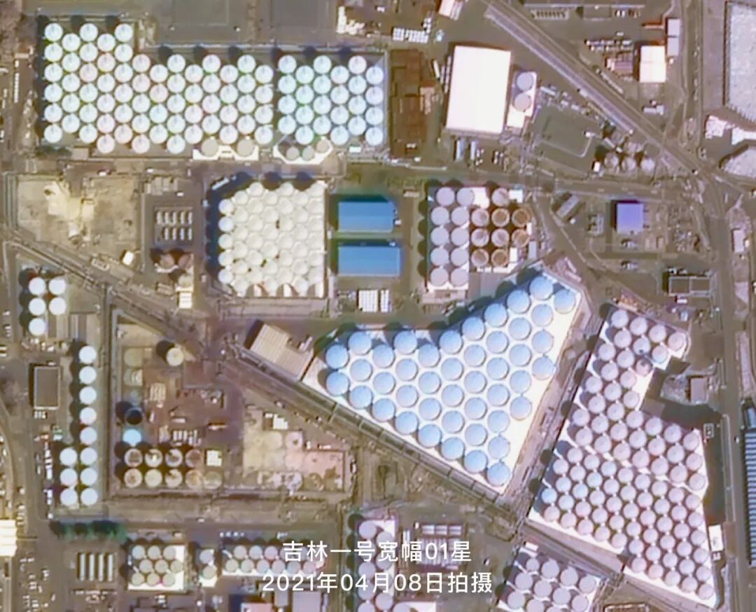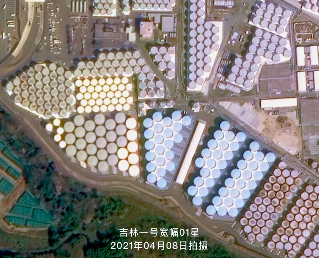 下图是吉林一号宽幅01星于2021年04月08日拍摄的福岛第一核电站卫星影像,从卫星图中可以明显地看到上千个密密麻麻的圆形核废水储水罐在厂区内摆放着。