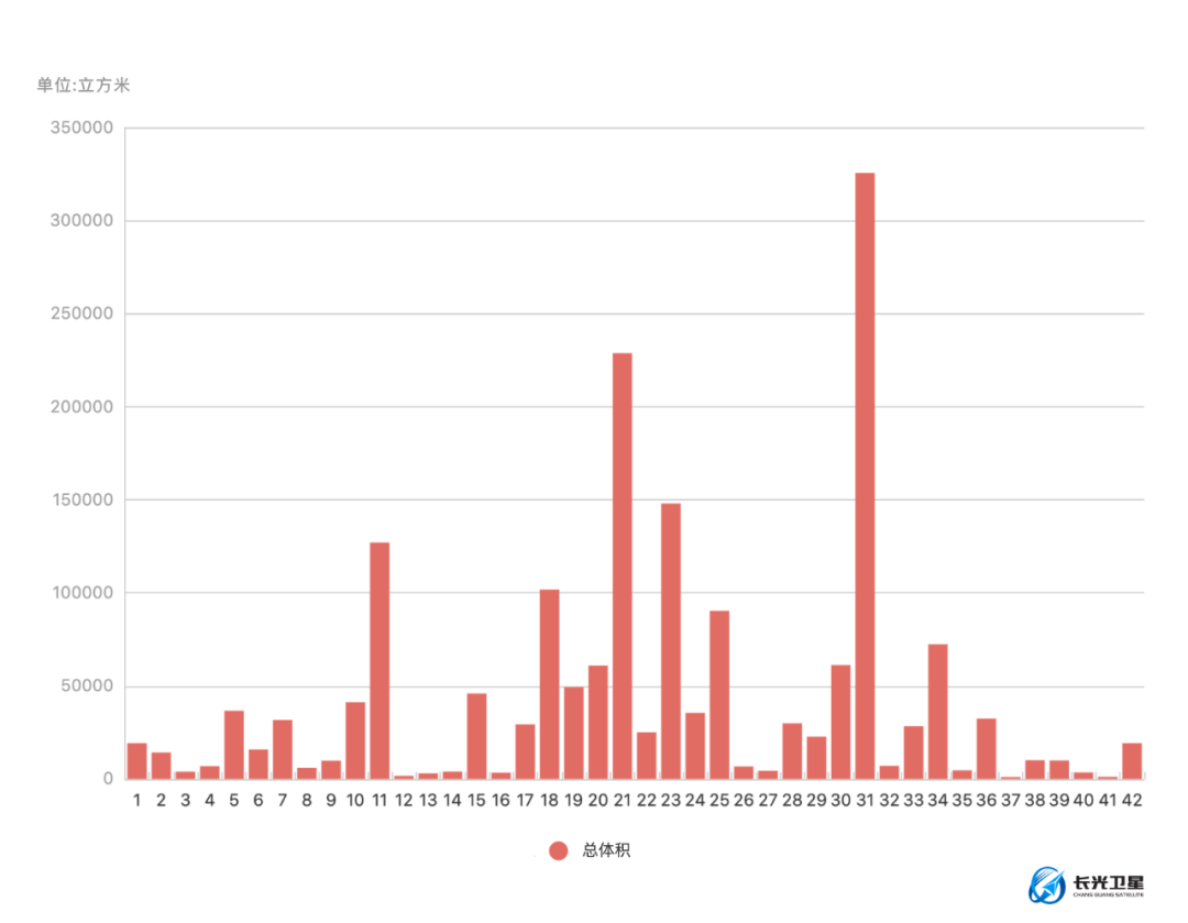 下图为每个类别的储存罐总体积对比图,42类储存罐可累计存储体积为1780397.809立方米。可存贮重量大约178万吨。