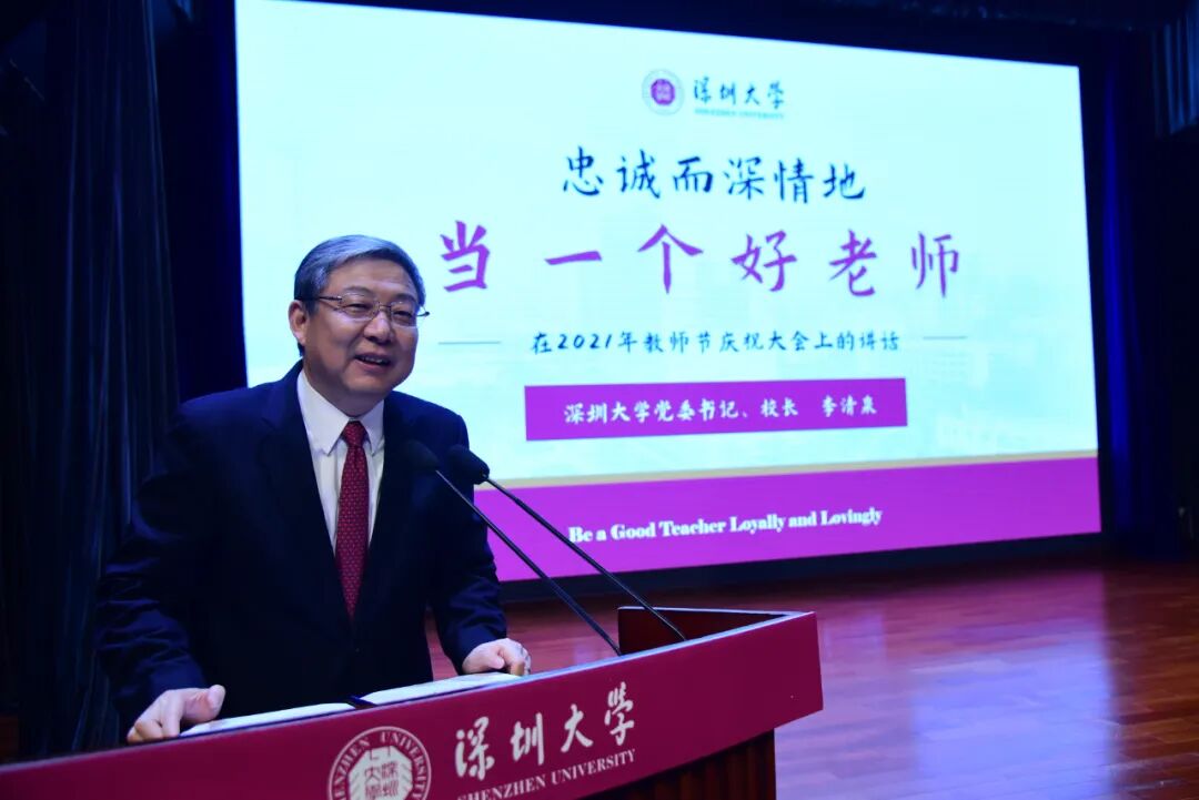 首先,我们要忠诚而深情地投身伟大事业。今年是中国共产党成立100周年,党史学习教育正在全党展开。当年“南陈北李,相约建党”,我们的前辈同行——两位大学教授在风雨如晦的旧中国带头干了这件开天辟地的大事,今天的我们实在有必要好好思考体悟这份历史的机缘。如果把深大38年的奋斗史置于百年党史的宏阔背景中观察,我们会发现,这所大学的诞生、发展和前途都在一个闪耀着真理光辉的理论体系及其伟大实践中进行,那就是——中国特色社会主义,照耀着党史中波澜壮阔的现在进行时和前程远大的将来时态。深圳大学应这份伟大事业而生,30多万深大人又将自身的奋斗融汇和浇铸这份伟大事业,以至于我们在感恩讴歌这个时代的时候,自己也成了这个时代的有力注释和动人风景。这些年,深大厚积薄发,十八大以来,我们高歌奋进。从前不那么显眼的地方高校,正在通过高质量内涵式发展不断刷新外界的认知。我们乐意成为国内外观察中国高等教育快速发展的窗口和例证,但不会沉迷在排行经济、数字游戏和圈子文化中顾盼自雄。我们这些年最为难能可贵的状态就是“不驰于空想,不骛于虚声”,始终坚定不移、坚韧不拔、坚持不懈地做自己认为最重要的事情——脚踏实地地做一个好老师,自强不息地成一身真学问。永远不负为党育人,为国育才的初心使命,为中国特色社会主义伟大事业,为“双区”国家战略培养建设者和接班人是全体深大教师对党和人民的庄严承诺,以前如此,现在如此,将来更不会改变!