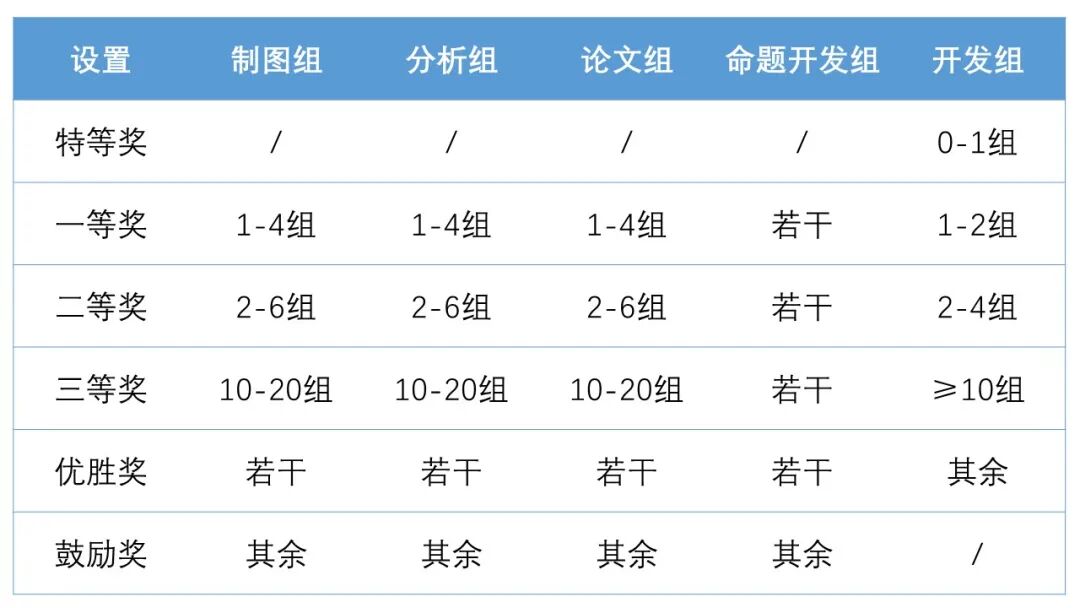 制图组、分析组、论文组和命题开发组由评审委员会评比并最终排名。开发组由评审委员会评比和排名,产生决赛名单,通过决赛现场或线上答辩,由评审委员会评比并最终排名。5月1日—8月1日:开启制图组、论文组作品接收通道5月1日—8月15日:开启分析组、命题开发组组作品接收通道
