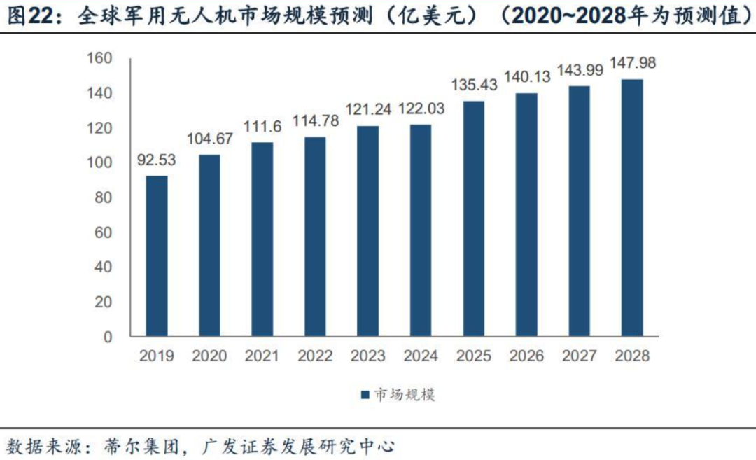 军用无人机市场发展日趋成熟,战争中无人机的任务范围越来越广泛。军用无人机对续航能力、巡航速度、飞行、高度、作用距离、任务载荷等都有很高的要求,根据不同的用途搭载各种专业的军事设备,如各类传感器、导弹、物资等。广泛应用到侦察预警、电子对抗、通信中继、军事打击、战斗评估等领域,分为无人侦察机/监视机、无人战斗机、通信中继无人机、电子干扰无人机等单一用途无人机,以及侦察打击一体化无人机等多用途无人机。据《无人机系统作战应用》(航空工业出版社,王进国),战争中无人机的任务范围涉及越来越广泛,从最近的局部战争情况来看,无人机系统已经用于进行近距空中支援、情报监视和侦察、战斗搜索与救援、空中遮断,以及对地打击和协调侦察评估等任务。多因素驱动无人机在军用领域需求不断扩大,作战环境持续的快速演变需要创新无人机系统作战运用概念。军用无人机具有人员零伤亡、作战性能优越、成本低等显著特点,已经逐步成为现代战争不可或缺的重要武器平台。据中航(成都)招股书,近年来,在战争信息化发展形势下,无人机等新型装备需求大幅提升,再加上部分地区不断爆发的安全问题、领土争端,导致全球军用无人机需求不断扩大。据《无人机系统作战运用》(航空工业出版社,王进国),面临作战环境持续的快速演变,需要创新无人机系统作战运用概念,未来战争要求军队,既要能进行小代价的非对称环境下的局部战争,又要赢得体系对抗环境下的战争,因而无人机系统将考虑用于更广泛的用途,并且针对实际需要和战争形态转变扩展其任务涵盖类型。军用无人机全球市场空间持续扩大,我国军用无人机的国际市场竞争地位逐渐加强。据中航无人机招股书,援引蒂尔集团的报告,2019年-2028年全球军用无人机年产值(含采购)逐年增长,到2028年产值预计达到147.98亿美元,年产值(含采购)复合增长率约5.36%,市场保持可持续的稳定发展。据观典防务招股书,我国军用无人机凭借着研发技术的发展,具有性价比优势,逐渐成为全球军用无人机市场重要的出口国之一,是美国军用无人机的主要竞争对手之一。随着我国军用无人机研发技术的发展,未来我国军用无人机的国际市场竞争地位有望进一步加强。