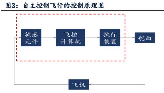 飞控系统是无人机飞行过程中的核心系统,可类比为有人机中的飞行员。飞控系统主要具备飞行控制和飞行管理两大功能,前者保障飞机运行的平稳性,兼顾无人机姿态和航迹的稳定及按指令或预设转变;后者指代数据设备管理和特定情景响应,包括采集飞行状态参数、处理故障及应急场景、计算导航路径等。自主控制、半自主控制、指令控制与人工控制是常见的无人机控制方式。其中,自主控制是飞控系统利用传感器新获信息、预设航路信息及任务规划信息自动控制飞行,具体过程为飞控系统中的敏感元件确定当前飞行路线,飞控计算机系统运行处理所获信息并发出指令,执行装置接收指令后带动舵面偏转,进而改变无人机航行路线。指令控制是由飞控系统接收由地面控制站的操作员所发送的遥控、遥测指令。而半自主控制恰好为自主控制与指令控制的融合,此时飞控系统同步响应传感器信息与地面指令,使无人机达到应有姿态,完成航线规划。
