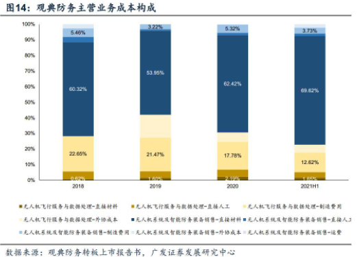 直接材料为民用无人机业务营业成本的主要构成。公共安全领域,以供应多款无人机系统、从事无人机禁毒服务的观典防务为例,观典防务2018~2021年H1四个报告期内直接材料占营业成本的比重分别为60.94%、55.55%、64.61%和71.27%,制造费用占营业成本的比重约为20%。工业领域,以在国内垂直起降固定翼无人机领域规模领先的工业无人机企业纵横股份为例,其2017~2020年H1原材料成本占主营业务成本的比例分别为84.95%、69.92%、74.26%和73.41%。