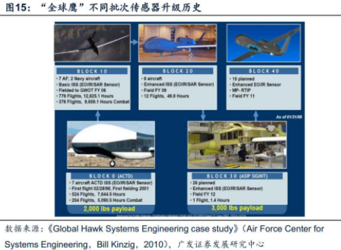 载荷(传感器)方向升级或仍然是军用无人机中短期内的主要发展方向。以美国高空长航时侦察机“全球鹰”项目为例,不同批次机型的更新升级方向主要与载荷(传感器)有关。据《GlobalHawkSystemsEngineeringcasestudy》(AirForceCenterforSystemsEngineering,BillKinzig,2010),“全球鹰”从Block0~Block40过程中,主要升级方向与其传感器有关,如从Block10的基础版集成传感器套件升级至Block40的增强型EO/IR传感器。据《“全球鹰”无人机系统项目费用和效能分析研究》(张海涛,中航工业发展研究中心,2014),“全球鹰”Block10/20/30/40型的单机成本分别为4640/5450/7610/8460万美元,其中各批次的任务设备成本分别为2390/1960/3810/4980万元,各批次单机成本变化的原因是机体结构不同,以及机载传感器日益先进,如Block30使用单机成本2000万美元的ASIP,而Block40使用了单机成本约5000万美元的MP-RTIP。