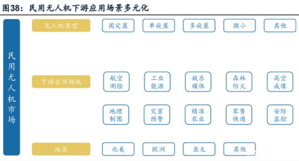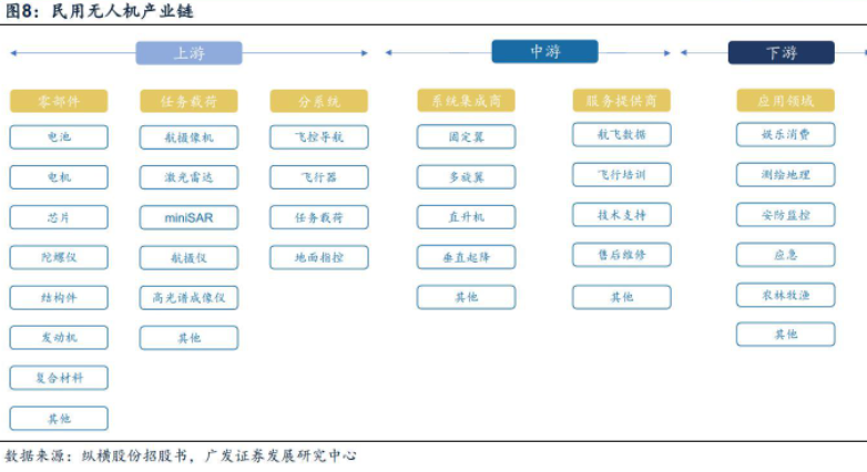 民用无人机领域,上游多为零部件制造商和分系统制造商,无人机主机厂承担系统集成及服务提供的职能。上游环节,一般可分为零部件、任务载荷件、分系统研制商。零部件制造环节,一般包括芯片、电池、电机、发动机、结构件等;任务载荷件环节,一般包含航摄相机、激光雷达、航摄仪、高光谱成像仪等专业任务载荷;分系统研制商一般分为飞控导航、飞行器、任务载荷、地面指控等分系统。中游环节,一般包含系统集成商和服务提供商,系统集成商多单指只包含无人机系统集成,不涉及服务提供,但目前多数企业均已涉及;但存在部分企业以提供服务为主,包含无人机航飞数据整合、飞行培训、技术支持、售后维修、租赁等。民用无人机下游应用广泛,包含娱乐、测绘、巡检、安防、应急、农林牧渔等。