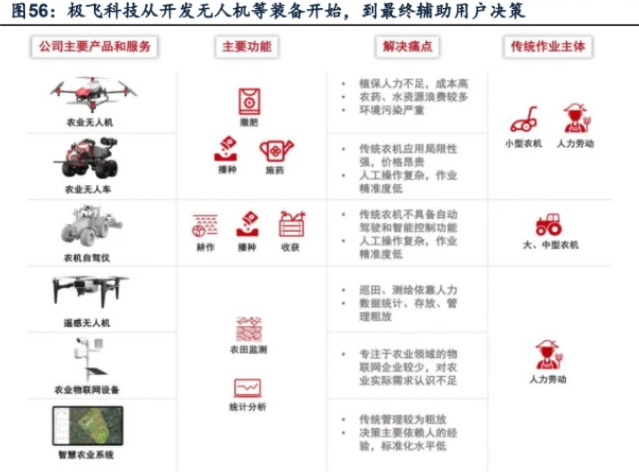 提高数据的使用价值,是民用无人机主机厂进一步实现价值创造的主要手段,也是形成该企业核心壁垒的关键环节。据前文,任务载荷是获取数据的实现方式,但近年来创新力量有朝上游载荷供应商集中的趋势。同时,由于民用无人机使用场景、使用用户在不同区域之间差异较大,从单一客户拓展到多用户难以实现边际成本递减。因此,对于民用无人机主机厂而言,价值创造更为可行的路径或为纵深单一用户的使用场景,从协助用户“获取数据”,向协助用户“使用数据”方向纵深。1.提高数据的使用价值,是民用无人机主机厂进一步实现价值创造的主要手段农业植保市场领域,以极飞科技为例,公司近年来形成了“全面感知→智能决策→精准执行”的智慧农业整体解决方案。首先完成农田、气象等环境信息采集;同时开发包括农业无人机、无人车在内的精准农业装备;最后通过智慧农业管理系统设备和数据闭环,由人工智能辅助决策,为智慧农业提供整体解决方案。例如,极飞科技的遥感无人机等设备采集作物生长状况和环境数据实时导入系统,利用公司的农业人工智能技术,结合对应的作物生产模型,为用户提供可续的生产决策支持,从“获取数据”到“使用数据”的转变,为极飞科技实现更大价值创造的主要手段。同时,我们认为,提高数据的使用价值,也是形成企业核心壁垒的关键环节。
