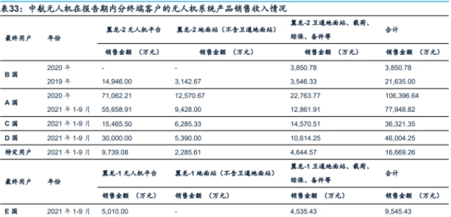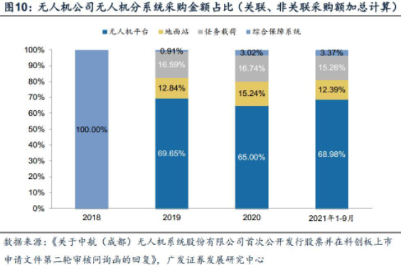 1.军用无人机系统:直接材料占成本结构90%以上,机体、任务载荷成本占比高直接材料为军用无人机业务的主要构成。以中航无人机为例,公司业务包括平台、地面站、载荷等无人机系统及相关产品,以及总装试验试飞等无人机技术服务。无人机系统产品端,2018年公司主要为航空工业成都所提供技术服务,无人机生产所需原材料由航空工业成都所提供,试飞等其他直接成本由航空工业成都所承担,因此公司未发生直接材料成本以及其他直接成本。2019年起公司开始自行生产销售无人机系统。除无人机平台外,其他产品均为不在公司内部加工制造的采购成品,故成本由原材料构成。无人机平台的成本构成以直接材料为主,翼龙-1、翼龙-2无人机平台直接材料占比约为80%。无人机平台为构成军用无人机营业成本的主要分系统,机载武器贡献较高成本占比。依据中航无人机所披露的无人机系统的各组成部分关联交易采购额,计算出翼龙系列无人机平台、地面站、任务载荷及综合保障系统所需采购金额占比。其中无人机平台由机体、飞机管理、动力、机械电器和机载数据链各系统组成。由于2018年中航无人机与航空工业成都关系的特殊性,当年分系统采购金额比例较之后差别明显。2019年~21年Q3四个报告期间,无人机平台始终为翼龙系列无人机采购金额占比最高的部分,均超65%;地面站与载荷占比相近。依据中航无人机原材料采购类别的划分,2020年机载成品(包括发动机、合成孔径雷达、挂架、飞机管理计算机、卫通天线组合、光电监视/瞄准装置等)在原材料采购金额中占比达57.91%。
