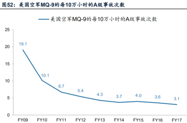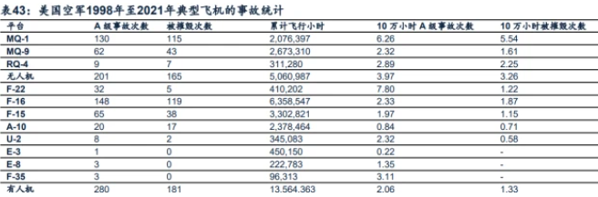 以民用当前市场空间较大的农业植保领域为例,无人机规模放量的前提在于低成本。植保无人机的需求基础包括农村人口用工成本上升、相比人工具有安全高效等多方优势。植保无人机,是用于农林植物保护作业的无人驾驶飞机,该型无人飞机有飞行平台、GPS飞控、喷洒结构三部分组成,通过地面遥控或GPS飞控,来实现喷洒作业,可以喷洒药剂等。需求本身存在,但作为行业工具,核心在于成本是否可以足够低到替代人工。我们以1000亩地单次喷洒农药为基础,考虑无人机的全寿命周期,基于一定假设条件下,我们计算1000亩地单次喷洒农药,人力植保、极飞P80、大疆T30的成本分别为7.52、3.51、3.7万元,即相对于人工,无人机植保确实具有显著的低成本特征,而若相关无人机成本在7.52万元以上,则相对用户则缺乏替换动力。无人机系统具有高度复杂性,全寿命周期的可靠性是其持续应用的前提。以军机为例,前期无人机的较低可靠性使其在全寿命周期成本优势上,低于有人机,限制了初期的行业大规模应用。根据美国空军现行标准,飞机事故根据直接损失金额的大小划分为不同等级,如A级指直接损失在200万美元以上,飞机事故率被定义为飞行10万小时所发生的累计事故,而无人机事故率较高。根据美国政府机构CRS于2022年4月发布报告《UnmannedAircraftSystems:CurrentandPotentialPrograms》,1998~2021年财年间,无人机系统的10万飞行小时A级事故率为3.97次,其中MQ-1为6.26次,有人机系统的A级事故率为2.06次。而在无人机发展初期,据美国兰德智库2020年报告《TrendsinU.S.AirForceAircraftMishapRates(1950-2018)》,PRA(远程控制飞机)在1990年代的A级事故率为61.8次,远高于同期其他有人机型。而在民用领域,类似情况也相对较多,如常见的“炸机”事件,无人机的可靠性成为其持续应用的前提。