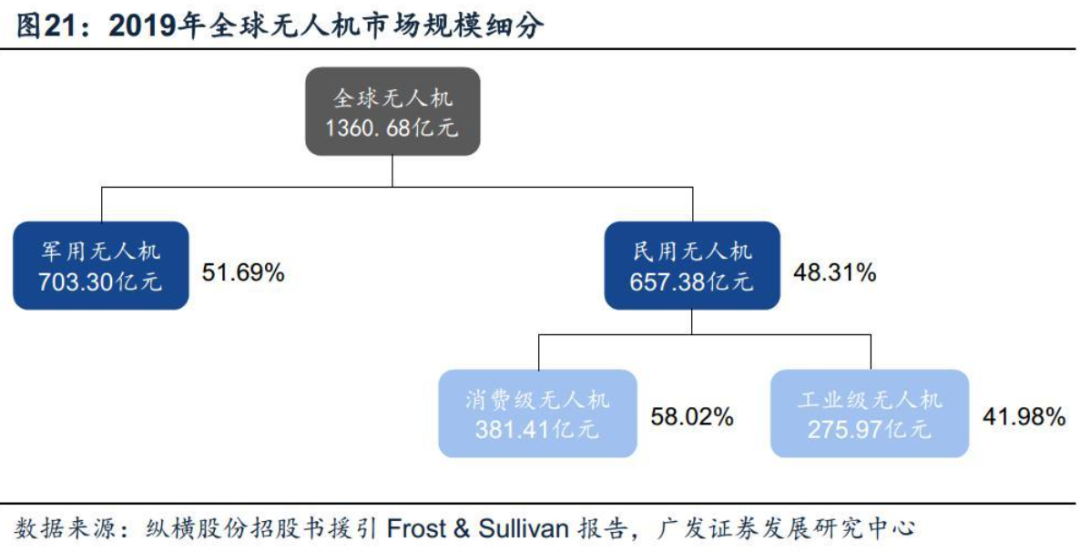 工业级应用场景需求的快速增长和军用无人机市场的增长驱动着全球无人机产业规模持续扩大。据纵横股份招股书,全球消费级无人机市场及大型军用无人机市场发展日趋成熟,无人机在工业级应用场景需求的快速增长和其他军用无人机市场的增长驱动着全球无人机产业规模持续扩大。2015年至2019年,全球无人机市场规模年均复合增长率为19.40%。据纵横股份招股书,援引Frost&Sullivan的报告,2019年全球军用无人机和民用无人机市场规模分别为703.30亿元、657.38亿元,分别占比51.69%、48.31%。预计到2024年,全球无人机市场规模将突破5000亿元。国内无人机市场空间快速扩大,2019年国内无人机市场规模已达435亿元。军用方面,据中航(成都)招股书,我国无人机系统发展起步晚于美国、以色列、英国等军事科技强国。近十几年来,我国无人机系统的发展呈厚积薄发趋势。各航空企事业单位以其技术和产业优势推动了产品技术和产业体系向高端发展,我国无人机系统发展势头较为迅猛。总体来看,我国无人机设计制造技术已达到世界先进水平。民用方面,据纵横股份招股书,国家相关主管部门近年来不断完善无人机分类标准、飞行管理、驾驶员管理等方面的法律、法规及规范性文件,为我国无人机产业健康规范发展提供了制度保障,叠加受益于消费升级及工业领域应用场景的扩大,民用无人机市场规模也在逐年扩大。2015年~2019年,中国无人机市场规模从155.51亿元增长到435.12亿元。