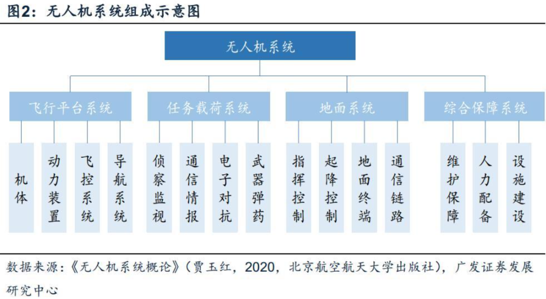 无人机系统通常由飞行平台系统、任务载荷系统、地面系统与综合保障系统构成。飞行平台系统是无人机的主体,整合动力装置、飞控系统、导航系统等部件后携带载荷实现空中飞行与任务执行。任务载荷系统是决定无人机不同用途的关键,所涉及任务设备包含侦察搜索设备、测绘设备、军用专用设备、民用专用设备等多种类型。除执行任务的直接载体之外,地面系统作为无人机系统的指挥中心,控制飞行过程与航迹、飞行平台的起降以及通信链路的工作,综合保障系统对各分系统进行维护保障、人员调配等,亦为无人机系统正常运转不可或缺的组成部分。