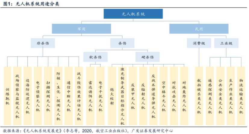 根据用途划分,无人机可以分为军用与民用两类,民用无人机又可进一步划分为消费级与工业级。无人侦察机/监视机、无人战斗机、通信中继无人机、电子干扰无人机和靶机是军用无人机的代表类型,不同载荷塑造杀伤性差异。无人侦察/监视机能够利用光学照相机等电子侦察设备对目标进行信息采集;无人战斗机配备兼具小体积与强攻击能力属性的硬杀伤武器实施空中对抗或对地轰炸;通信中继无人机为军机提供通信服务,扩展通信数据的传输范围;电子干扰无人机采用有源或无源干扰方式,诱导敌方雷达等电子设备暴露并实施破坏;靶机通过模拟飞机、火炮及导弹成为地面防空兵器效能鉴别及相关作战人员训练的辅助装备。除上述单一用途外,多用途军用无人机同样为重要组成部分,如随轻型精确制导武器、自动目标识别等技术的发展而日益丰富其谱系的察打一体无人机。依据面向用户群体的不同,民用无人机可以分为消费级无人机和工业级无人机。消费级无人机关注拍摄效果与操作简易性,以影视拍摄、日常拍摄等航拍娱乐类为主。工业级无人机致力于经济效益的创造和行业问题的解决,主要包括用于国土资源调查、气象探测等遥感探测类;用于搜捕营救、反恐除暴、边境巡检等的公共安全类;用于农业植保、林业防护的生产作业类,以及用于短途快递投放、长途物资运输的物流运输类等。
