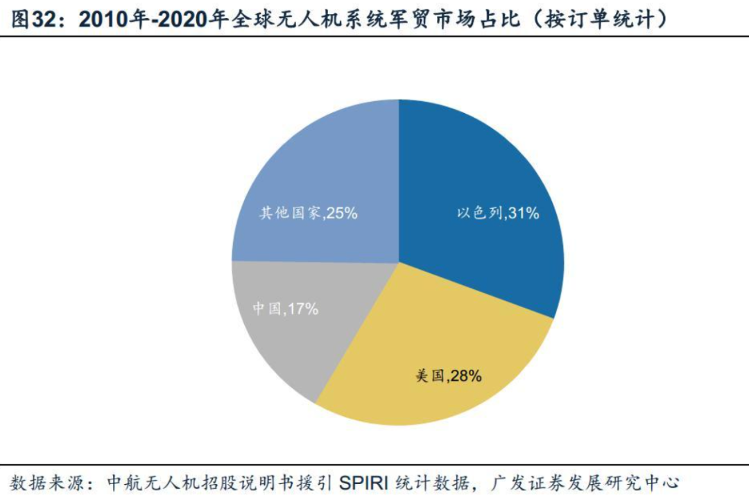 美国、以色列、欧洲等为军用无人机领先者,中国起步较晚但发展势头迅猛。按技术水平划分,美国、以色列、英国和法国等国军用无人机研制生产水平领先,型谱基本完备,是国际军用无人机市场的主要竞争者;中国、俄罗斯、日本等国有能力从事军用无人机的自主研发,但发展略慢于领先国家。具体来看,美国是世界上最早研制并使用无人机的国家之一,技术先进,种类丰富,已形成覆盖高、中、低空,远、中、近程,大、中、小型,战略、战术、攻击、对抗多层次的完整无人机体系。以色列无人机技术主要源自美国,依托仿制、改造、自主创新逐步发展起来,在无人机技术方面成为美国之后的世界第二号强国,其无人机战术运用经验丰富,已形成从长航时无人机、战术无人机到攻击无人机的较为完整的无人机体系。中国军用无人机系统的自主研制相较于军事强国起步稍晚,经数十年的积累核心技术和产品性能紧跟国际发展前沿,基本满足了国内军用需求,并凭借性价比优势走向国际市场。但中国现有谱系主要为中高空、远程、重型的无人机,在中低空、小型、轻型无人机领域仍存在完善空间。除各国国内装备外,由于当前具备军用无人机自主生产能力的国家相对有限而需求又较为旺盛,无人机军贸市场活跃,领先国占据主要出口份额。据无人机招股说明书援引SPIRI统计数据,2010至2020年间,无人机军贸市场前三大出口国为以色列、美国和中国,市场份额分别为31%、28%、17%。