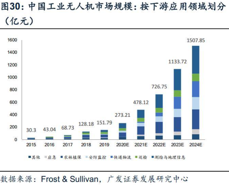 工业无人机应用场景日益完善。工业无人机产品具有使用成本低、地勤保障要求低、机动性强、安全性高、提供信息更加及时等优势,相比于传统作业方式,工业无人机更能胜任复杂环境下的作业任务。随着工业无人机技术的进步和行业解决方案的成熟,工业无人机应用场景日益完善,目前工业无人机产品已成熟应用于巡检、测绘与地理信息、安防监控、农林植保等领域,正在进一步拓展应急、水利、环保、气象、物流运输等新兴应用场景,随着工业无人机的应用领域持续拓展和深化,工业无人机行业将具有更大的商业价值和市场规模。据极飞科技招股书,经过近年的发展,农业无人机行业集中度逐步提升,农业无人机主要应用于精准喷洒、智能播撒、巡田测绘等,少人化或无人化的智慧农业生产使得农机产品的效用将不再局限于简单的效率提高,更在于辅助决策、自主决策,实现农业生产从机器换人向智慧决策的转变。长期看,据观典防务招股书,预计随着大数据、人工智能、云计算、5G等新技术、新模式的应用和发展,数据的获取方式、储存形态、传输渠道和处理方式等发生了新的变化,新技术的全方位渗透将不断拓展工业无人机行业的应用深度和广度,为工业无人机产业的产品、服务需求带来新的增长点。国内外工业无人机市场空间快速拓展。据中航无人机招股书援引Frost&Sullivan报告数据,预计2024年全球工业无人机市场规模将达到3208.20亿元,2015年-2024年年均复合增长率达57.55%。据纵横股份招股书,2019年我国工业无人机市场规模为151.79亿元(包含无人机整机及无人机服务),占全球相应市场规模的比例为55.00%,其中多旋翼无人机、垂直起降固定翼无人机是占比较高的工业无人机类型,整机市场规模分别为40.77亿元、5.12亿元,占工业无人机整机市场规模的比例分别为80.54%、10.12%。预计到2024年,我国工业无人机市场规模将突破1500亿元。预计至2024年,测绘与地理信息、巡检、快递物流、安防监控等为我国工业无人机前四大应用市场。