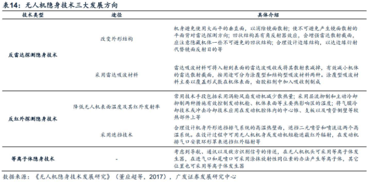 无人机任务载荷技术迭代主要体现在传感器、通信中继载荷与机载武器。军用无人机系统的任务载荷可以分为传感器、中继技术设备、武器弹药及货舱四类。其中,传感器方面的重点技术研制方向包括多光谱/超光谱成像(MSI/HIS)、合成孔径雷达等。多光谱/超光谱成像技术具备全色照相传感器的能力,能够获取敏感细微信息,减少误判可能;机载动目标监视模式获得应用的趋势之下,合成孔径雷达将实现对地面动、静态目标的精准定位。为满足无线通信功能和兼容性需求,通信载荷利用软件支持多种波形或成为主流发展趋势,且受小型战术无人机载重限制趋于小型化。机载武器方面的技术发展方向由现役改进转向专用研制和新技术攻关。长期看,隐身高空高速、僚机、蜂群化等或为军用无人机长期的发展方向。向隐身、高空、高速、长航时方向发展。隐身、高空、高速、长航时不仅可以保障无人机的运行安全,还可以扩大无人机作战半径,提升工作效率,从而进一步发挥军用无人机系统战场侦察、监视和攻击作用。据中航无人机招股书,隐身无人机是现代隐身技术与无人机技术结合的成果,在未来的空战中,隐身无人机将成为高性能防空武器的典型代表,并大大降低无人机的击毁率,提高军用无人机的战场运作空间,降低无人机作战成本。此外,为提高军用无人机持续侦察能力与作战能力,并在侦察时获得最准确、最全面的敌方情报,提高续航能力、飞行速度与飞行高度也成为世界各国对于无人机系统研究的重点发展方向之一。