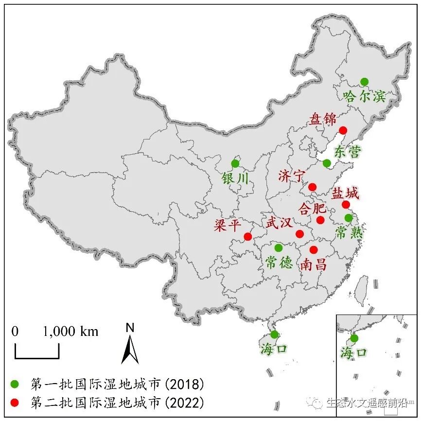 国际湿地城市是指按照拉姆萨尔(Ramsar)《湿地公约》决议规定的程序和要求,由各国政府提名,经《湿地公约》国际湿地城市认证独立咨询委员会批准,颁发“国际湿地城市”认证证书的城市。开展国际湿地城市认证工作是全球加强城市湿地保护的创新举措,旨在提升各国政府部门和社会各界湿地保护意识,倡导城市与湿地和谐共生理念,将城市发展与湿地保护深度融合。2018年10月,全球共18个城市被评为首批国际湿地城市并授牌,中国有6个城市:哈尔滨、海口、银川、常德、常熟、东营。2022年6月,全球共25个城市被评为第二批国际湿地城市,中国有7个城市:合肥、济宁、梁平、南昌、盘锦、武汉、盐城。截至目前,全球共有国际湿地城市43个,其中中国13个,位居第一。中国国际湿地城市分布图