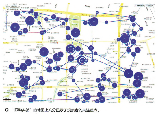 现在有一种专门搞“眼动实验”的研究,把计算机屏幕生成的地图界面,放在一个仪器设备上,让相关的人员去看,看观察者眼睛的关注点都在什么地方。圈子大的地方说明这个地方看的时间长一点,重点关注的是眼睛的运动轨迹跟符号的大小,从而了解用户对什么样的地理信息感兴趣。通过这样一次的研究,尽量提高我们行业服务的水平。