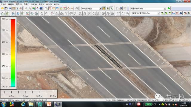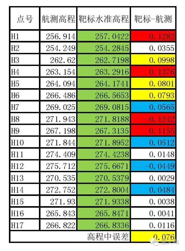 1. 实验目的:飞行计划设定、航拍正射影像图纠正效果、多架次间免像控处理后影像接边情况。2. 实验参数:地面采样间隔:10cm,飞行架次数:4次,测区面积:7.8平方千米。a) 飞行计划软件操作比较简单,设定地面采样间隔后软件按自动按架次分割区域。b)可以根据地形起伏情况随地形变化自动调整航高,保持地面采样间隔一致性并降低了低空飞行碰撞风险。c) 估计是考虑到无人机飞行航高低、像幅小以及内业影像纠正拼接处理速度的原因,机身搭载1600万像素的相机性能一般,但是纠正后的正射影像图整体效果还是比较理想,房屋边角线整齐,即使在测区边缘影像拼接畸变也不甚明显。d) 精度检测:利用测区既有地形图(1:2000)特征地物与航飞影像套合检查,资料吻合程度较好。二、中级检测:某乡镇规划1:1000地形图航测项目1. 实验目的:熟悉软件流程,确定能否满足1:1000比例尺成图要求。3. 实验参数:地面采样间隔:10cm 测区面积:22.6平方千米。4. 实验结果:正射影像图纠正准确,无明显畸变,架次间接边吻合性好。DLG平面精度与高程精度满足设计要求,顺利通过规划部门组织的检查验收。1. 任务要求:获取既有高速公路硬化路面高程,高程点密度10-12点/平方米,高程精度±10cm,提取道路中心线与桥梁等构造物特征线。2. 工作方案:考虑到测区地形起伏与高大建筑影像,为保证无人机安全航飞,设定参数如下:地面采样间隔=3cm,飞行航高约120米,模式自动适应地形,每架次有效航飞长度约3km,航飞带宽200m。3. 靶标设置:为检核航飞精度,在高速公路或其他硬化路面边缘每隔500m布设一靶标点,靶标尺寸:30cm*30cm,该实验项目共布设靶标点17点。其中差值最大点为H4,差值0.1376m,平均高程中误差7.6cm。