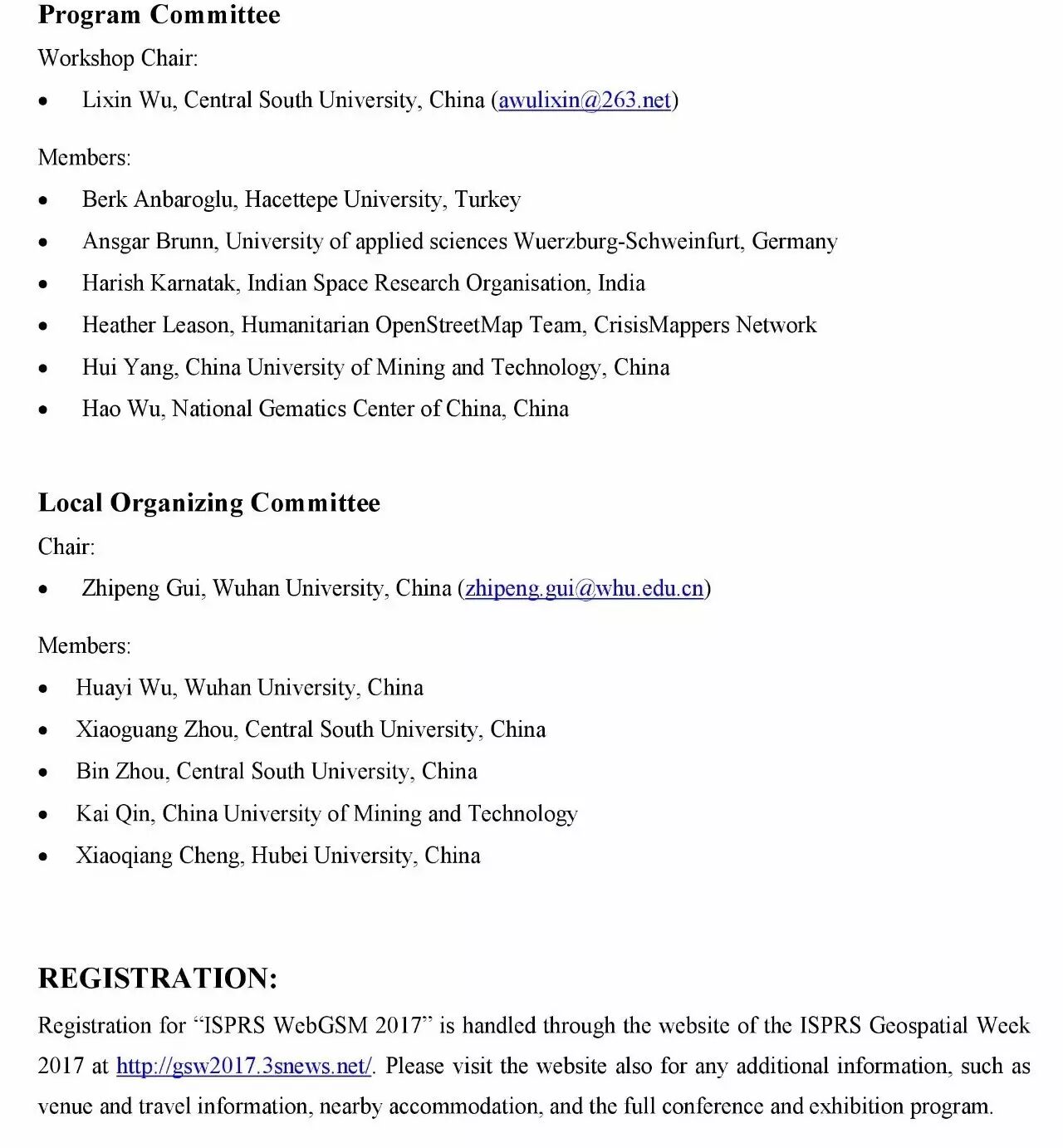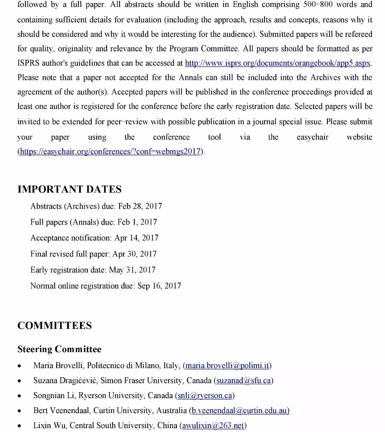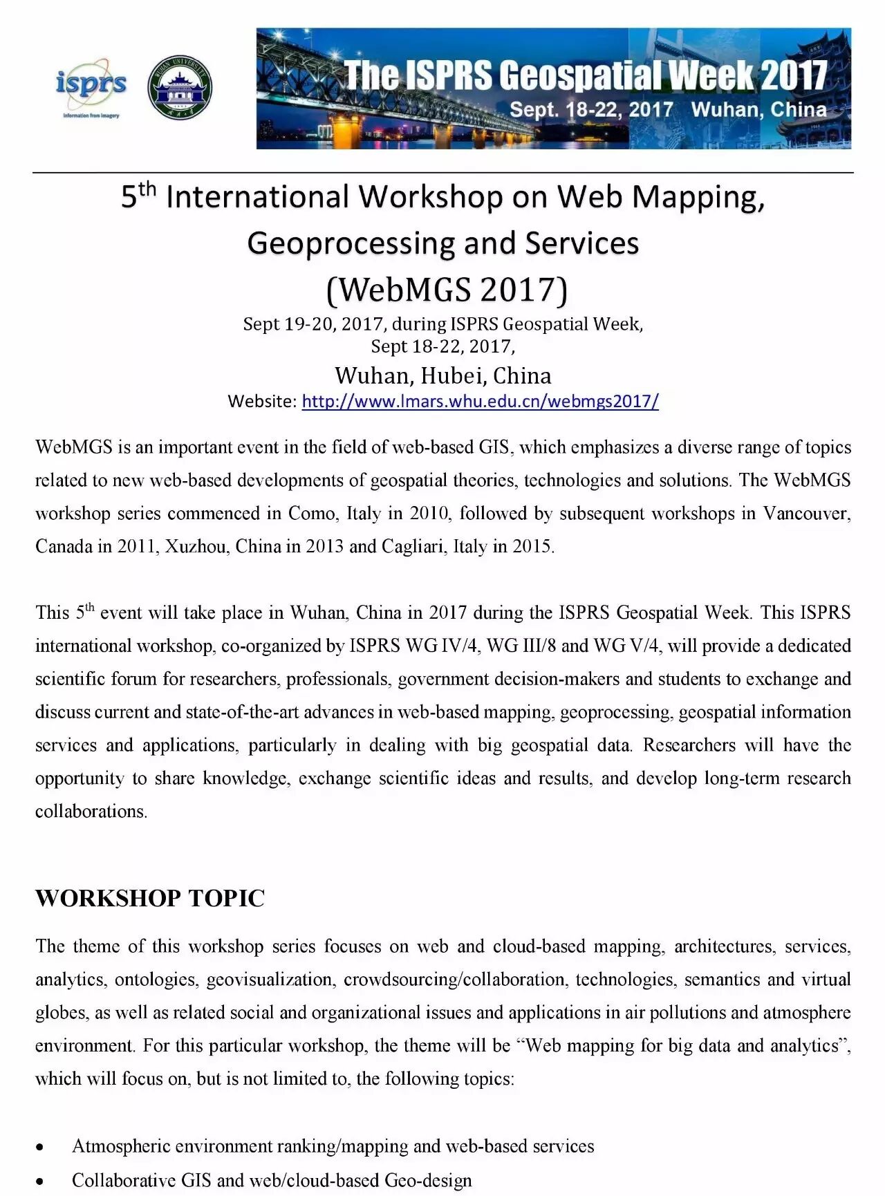 WebMGS 2017(5th International Workshop on Web Mapping, Geoprocessing and Services)是第五届Web制图、地学处理和服务国际研讨会,是网络地理信息领域的重要研讨会,由ISPRS WG IV/4, WG III/8 and WG V/4联合主办,武汉大学承办,将于2017年9月19-20号,在武汉召开。下面是大会举办相关文件。