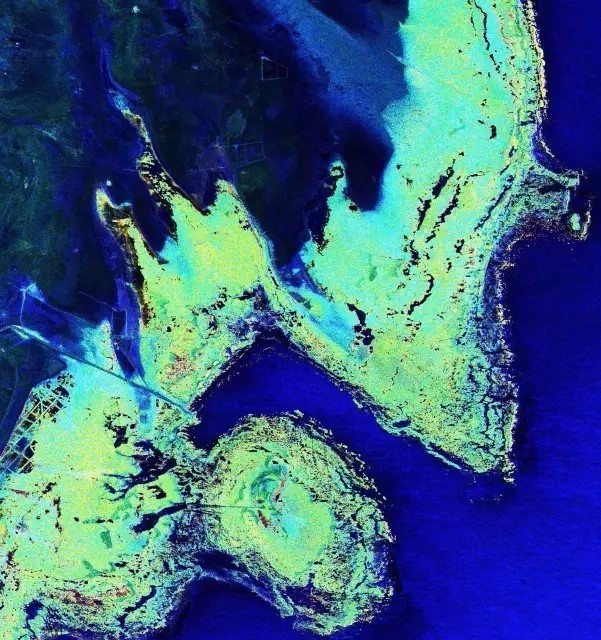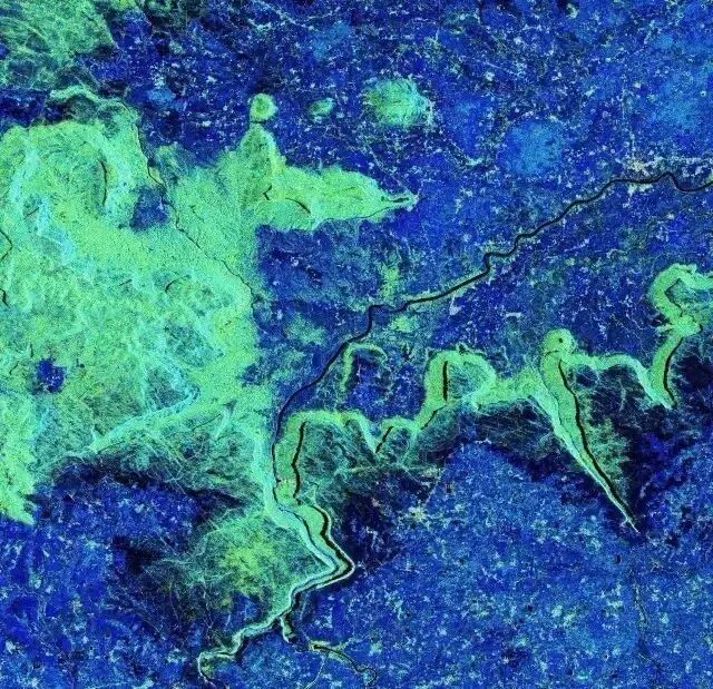 在这里稍微科普一下:为获取这些图像,高分三号卫星首先会发射电磁波,电磁波在照射到地面后会被散射到各个方向,其中有一部分电磁波会恰好反射回高分三号卫星。高分三号卫星记录这些电磁波信息,通过极化分解技术可以提取出地物的电磁散射特性,如是否包含体散射成份(就是地上乱七八糟啥都有,典型如热带雨林)、面散射(就是地面比较平整,典型如海面和裸地)和二次散射成份(就是有平地和墙壁,典型如城区)。通过伪彩色合成将体散射用绿色表示、将面散射用蓝色表示、将二次散射用红色表示,就可以获得上面这些图像了。这些图像主要对应裸地和植被区域,因此成蓝、绿色调,植被中难免会存在一些二次散射成份,绿色加红色就有了黄色。