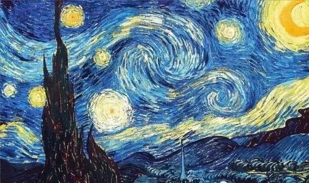 1889年,梵高在创作了其代表作油画《星空》,该画以黑色、蓝色、黄色三种色调为主,展现了一个高度夸张变形与充满强烈震撼力的星空景象。