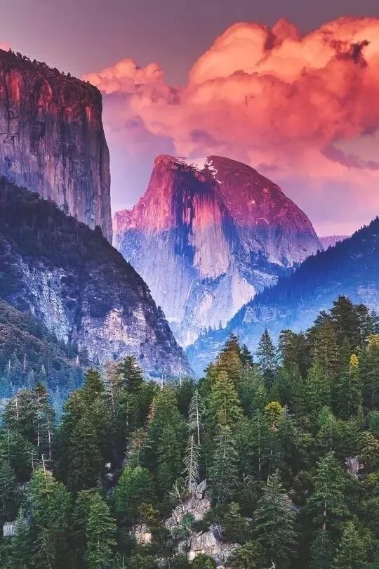 加利福尼亚的约塞米蒂国家公园,每到傍晚,绿色的森林、深蓝的山石和天空的朝霞形成一幅绝美的画卷。