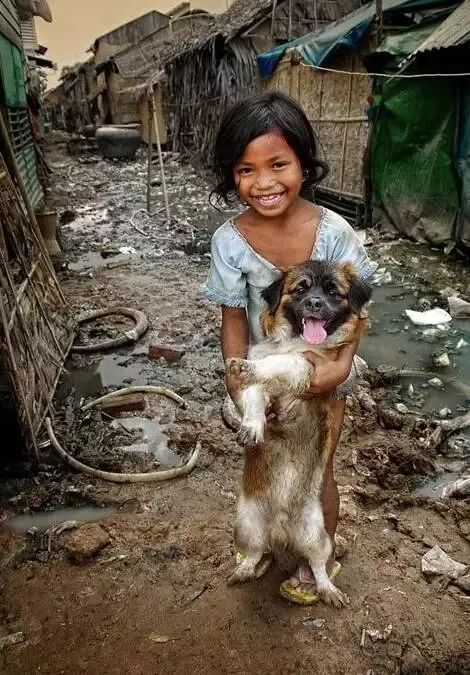 这是一个住在贫民窟的小女孩,一场风暴过后,四处狼藉,当摄影师将镜头对准她时,她和心爱的狗依旧露出灿烂的笑容。