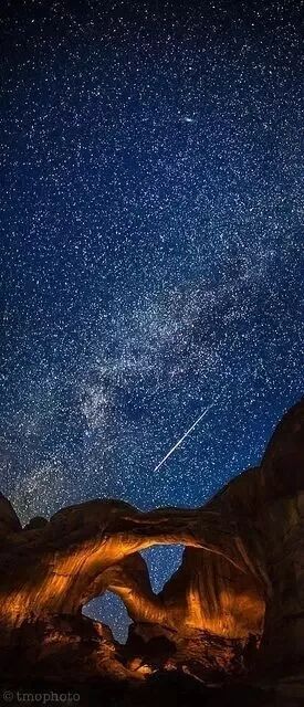 美国犹他州的拱门国家公园,天然形成的拱门石和一望无际的澄澈星空。