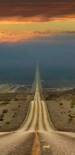加利福尼亚的死亡谷国家公园,笔直的公路仿佛要通往天际。