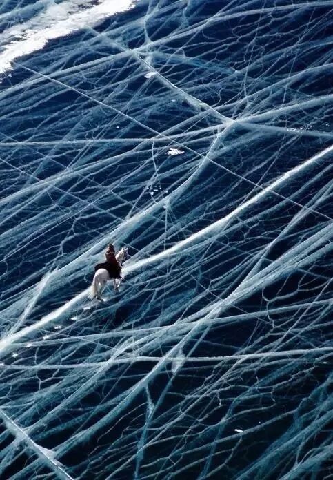 贝加尔湖,是世界上最大的淡水湖的。每到冬季,卡车和动物走过的痕迹形成了一条条的裂痕,不过不用担心,冰通常都有1.5米厚,看似危险的冰面其实很安全。