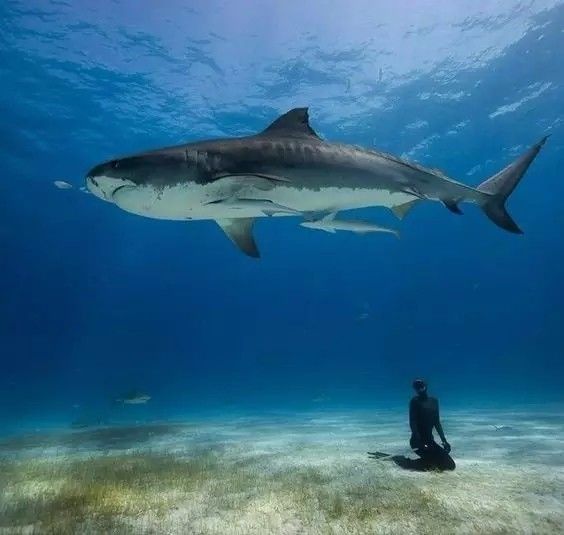 一位潜水员偶遇一条大鲨鱼,出于对生命的敬畏呈跪坐姿势。