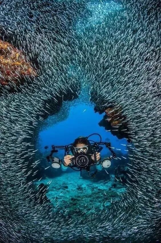 海底摄影师常常需要冲出各种各样的鱼群。