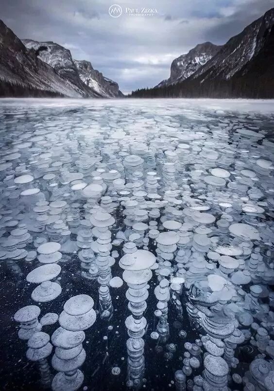 加拿大的米利万卡湖,一到冬天就有成千上万的湖底甲烷气泡被冻住,仿佛层层叠叠的小石头。