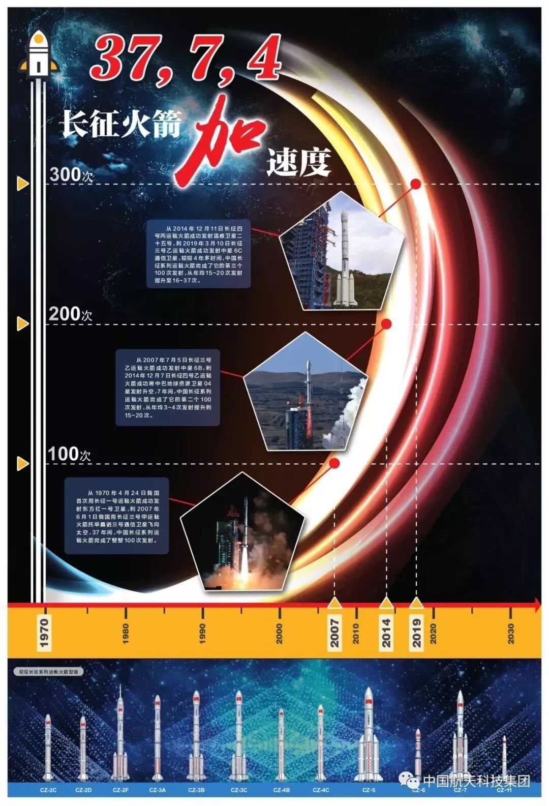 自1970年4月24日长征一号运载火箭首飞至2007年6月1日长征三号甲运载火箭发射鑫诺三号卫星,长征系列运载火箭实现100次发射用时37年;再至2014年12月7日,长征四号乙运载火箭成功发射中巴资源卫星,长征火箭完成第二个100次发射用时7年多;今天,长征火箭完成第三个100次发射,仅用了4年多时间。